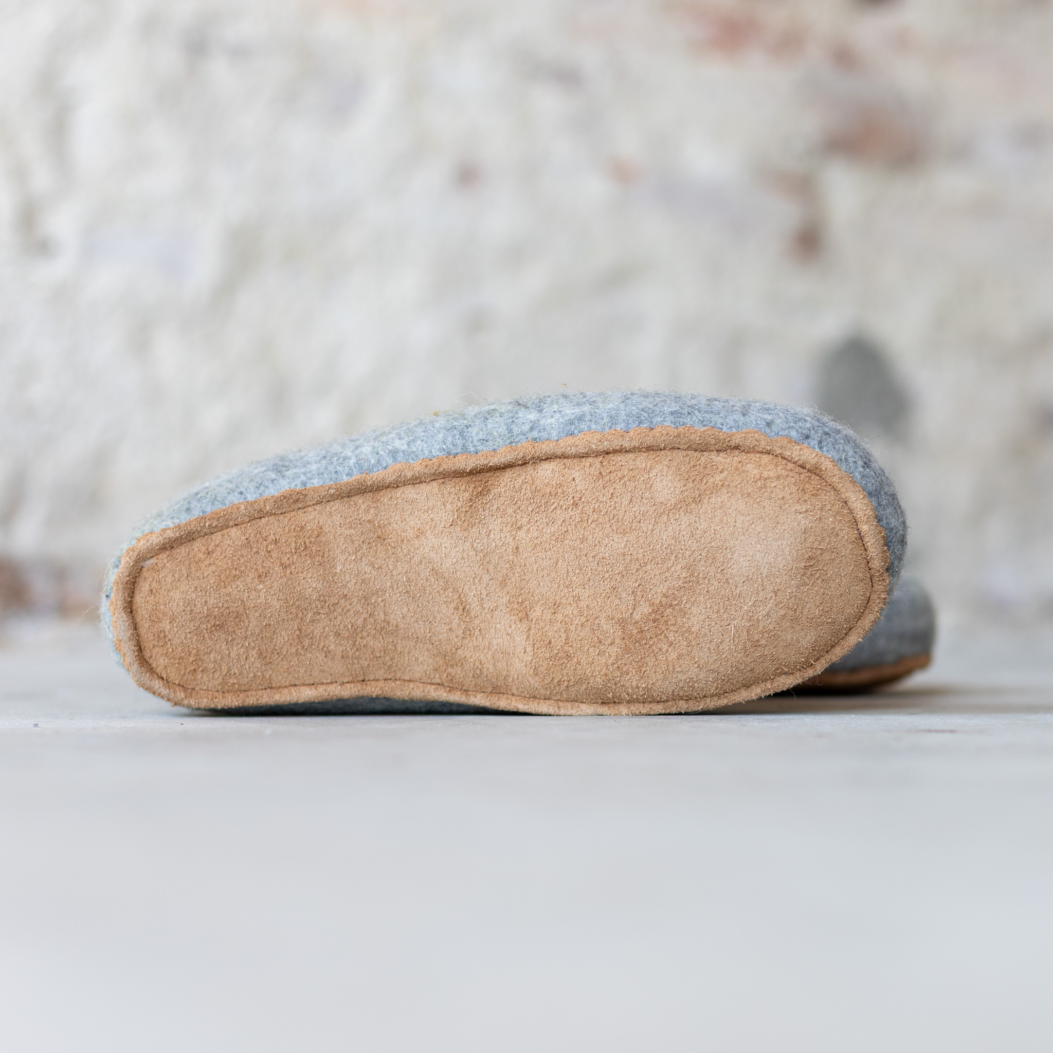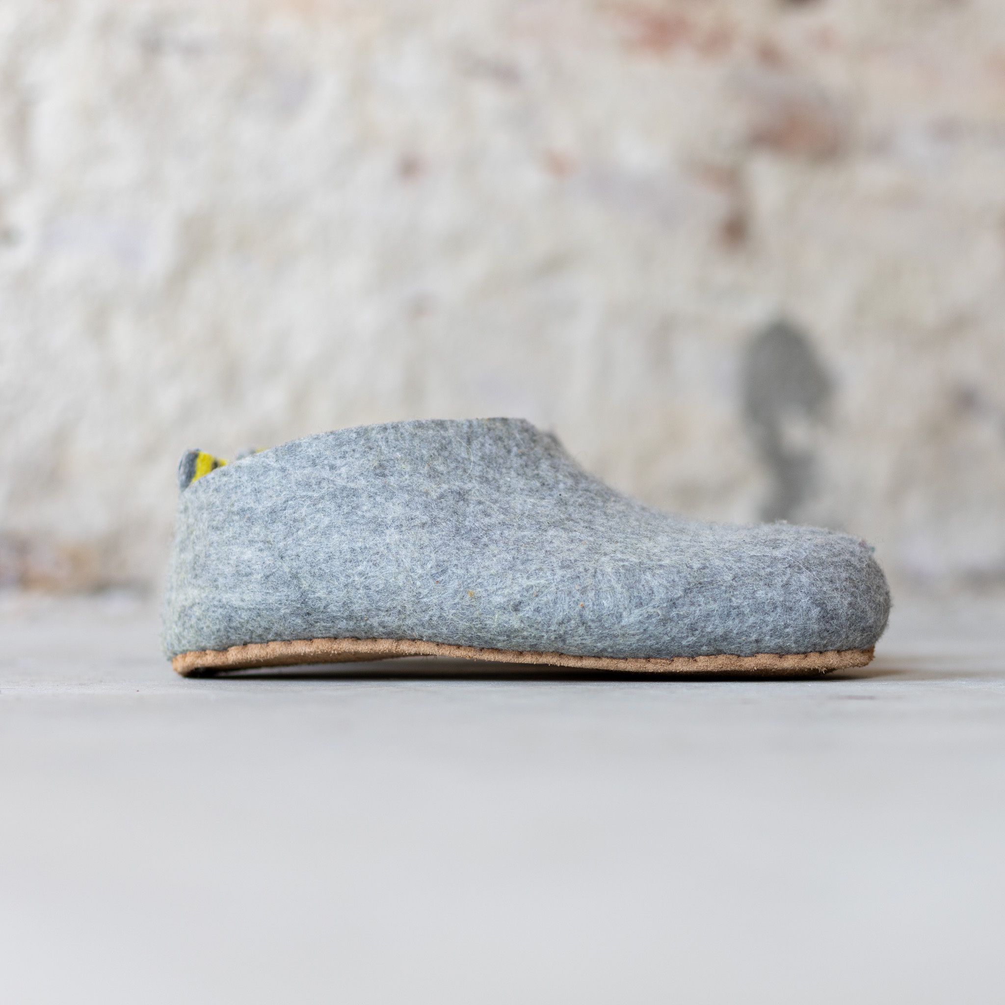 De schapenwollen pantoffels bestaan uit een vilten buiten en binnenlaag. De buiten laag is van grijze wol. De wol aan de binnenkant heeft een dessin van geel met grijze strepen.