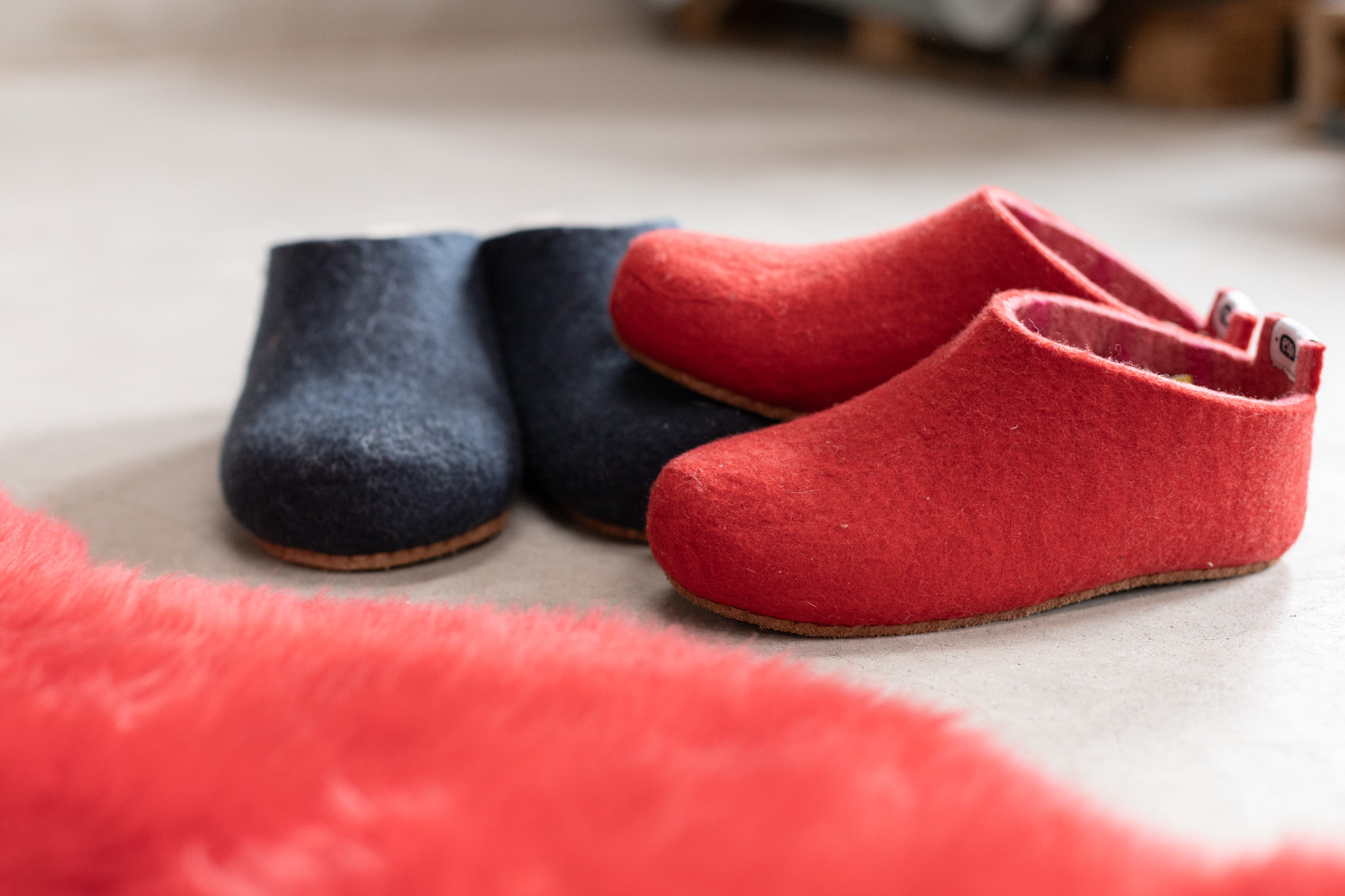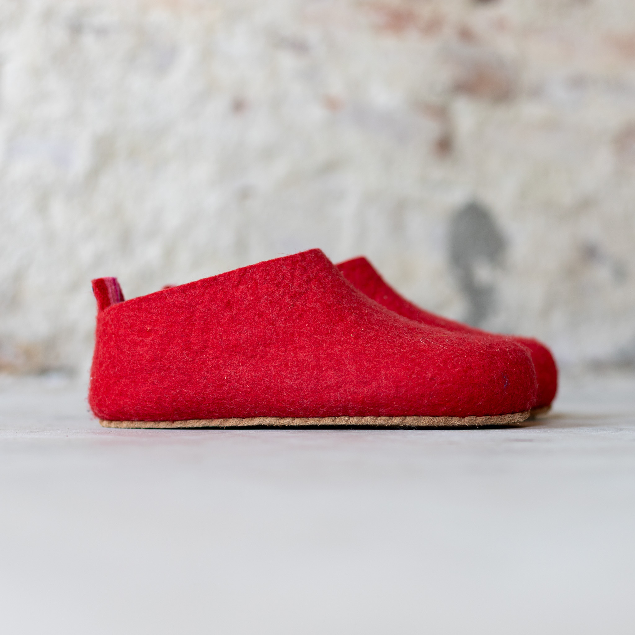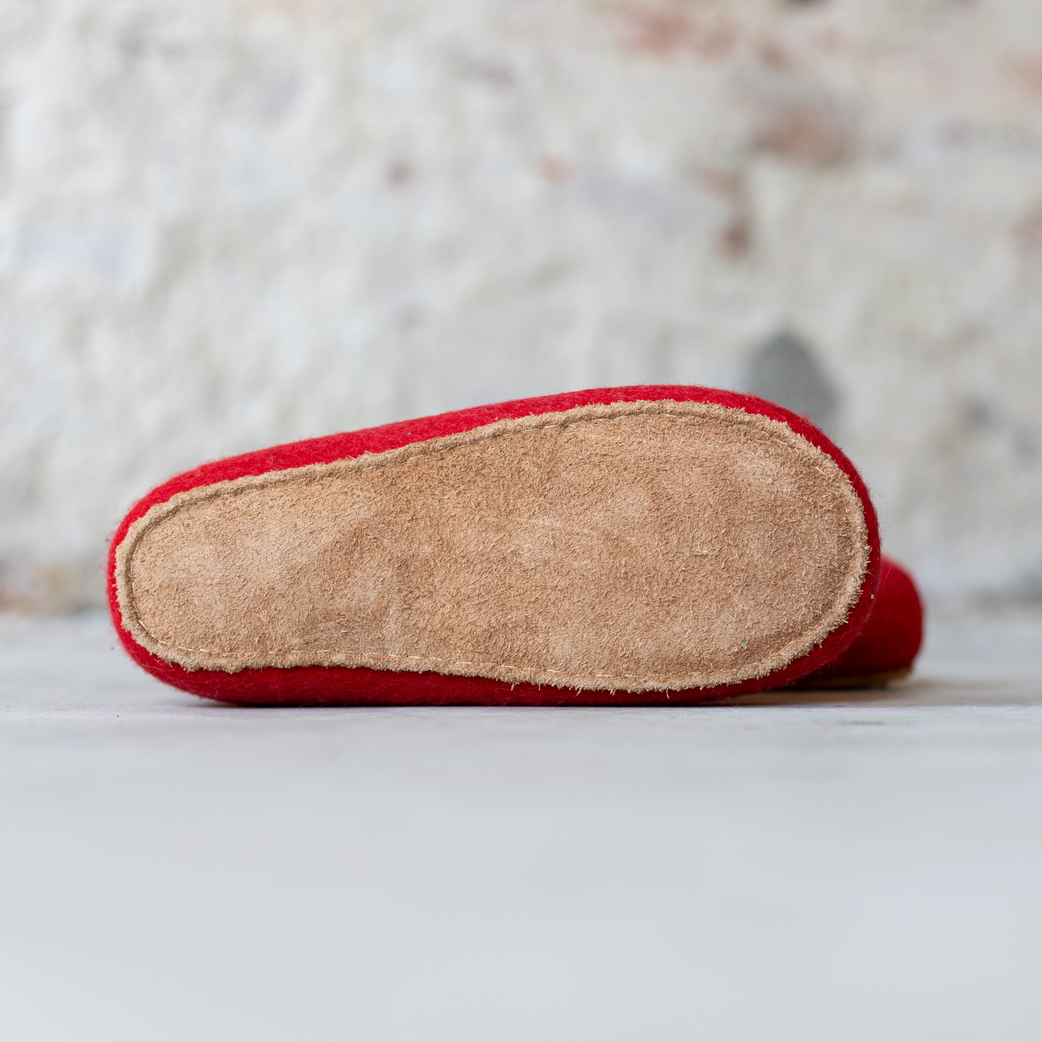 De schapenwollen pantoffels bestaan uit een vilten buiten en binnenlaag. De buiten laag is van rode wol. De wol aan de binnenkant heeft een dessin van roze met oranje strepen.
