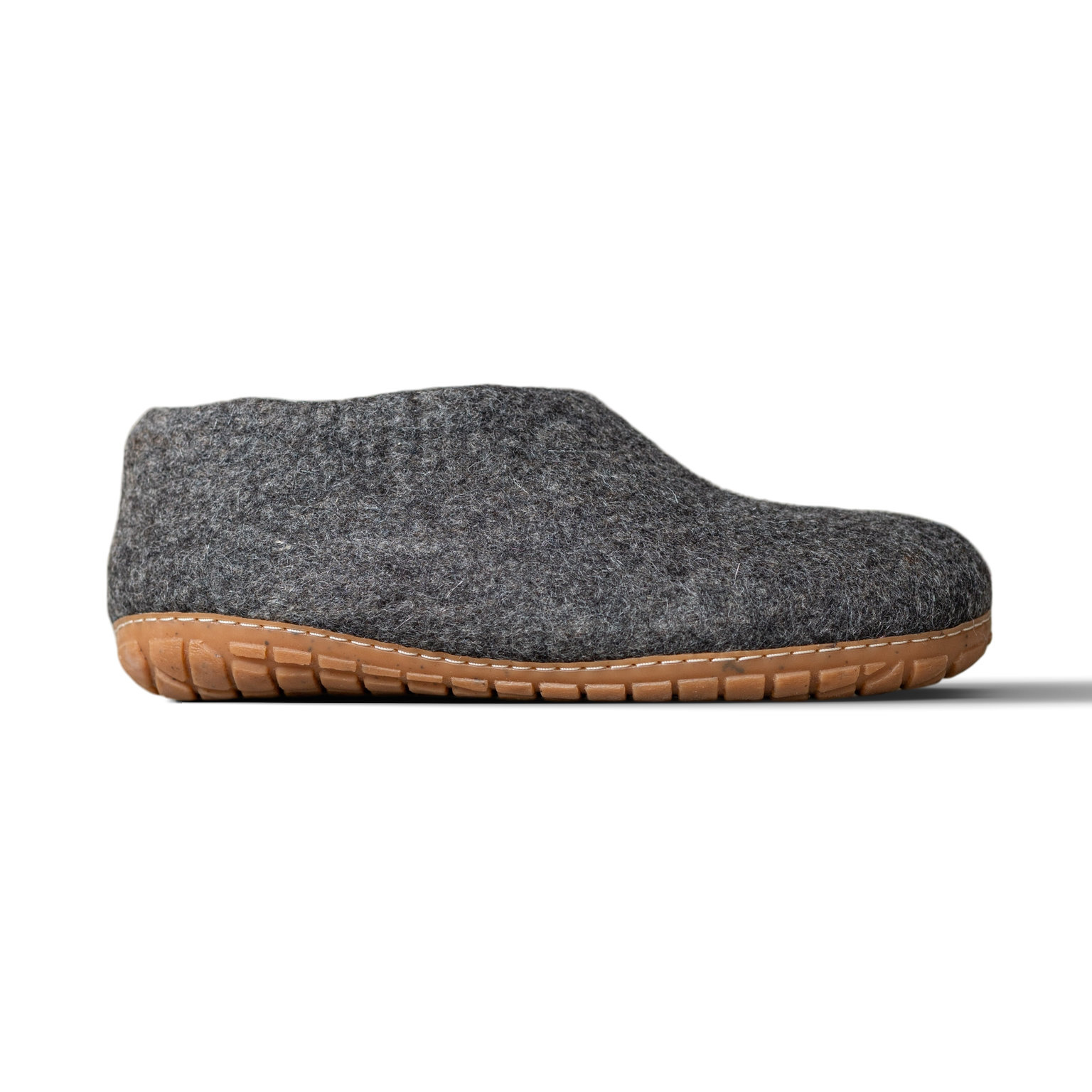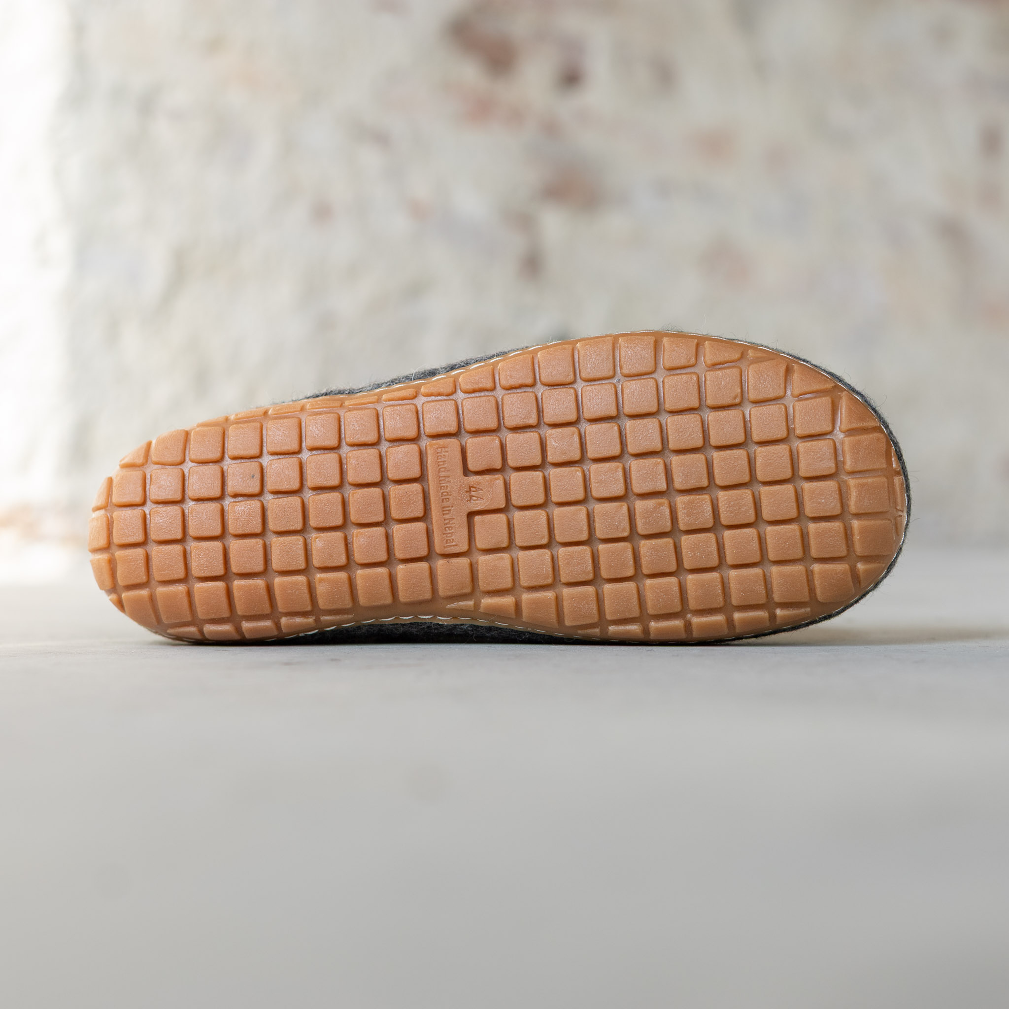 De Vilten Heren Pantoffel Ravi in donkergrijs met rubberen zool biedt comfort en duurzaamheid, geschikt voor binnenshuis en korte uitstapjes buiten. Verkrijgbaar in maat 42 t/m 46.