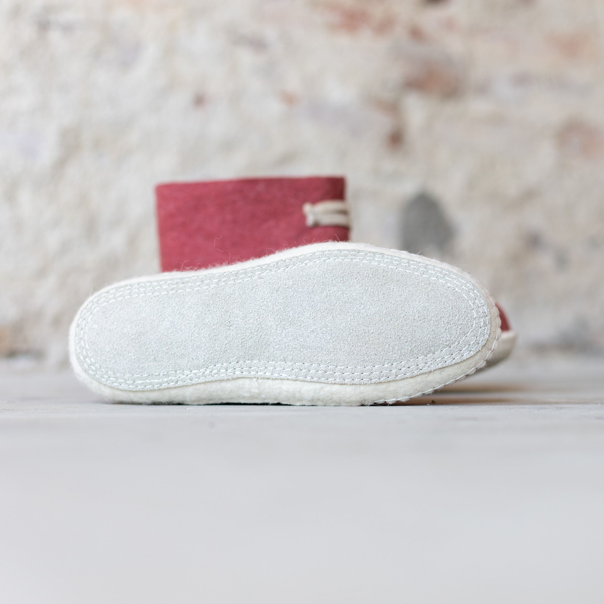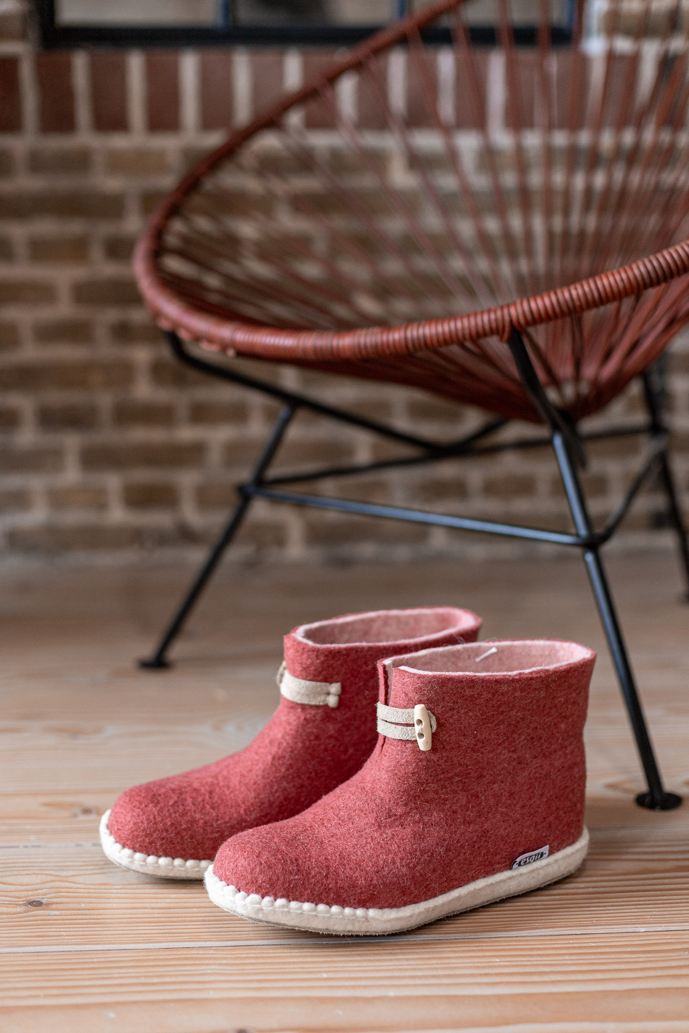 De hoge pantoffels bestaat uit een buiten en binnenlaag. De buiten laag is een koraal kleur wol. De wol aan de binnenkant heeft de natuurlijke kleur waardoor er nog Lanoline in het gevilte wol zit. De lanoline (dierenwas) die zich in de wol bevindt, wordt gebruikt in de medische wetenschap. Het verzacht de voeten met reumatische, gewrichts- en spierpijn. En koude voeten zijn verleden tijd met deze wollen sloffen!