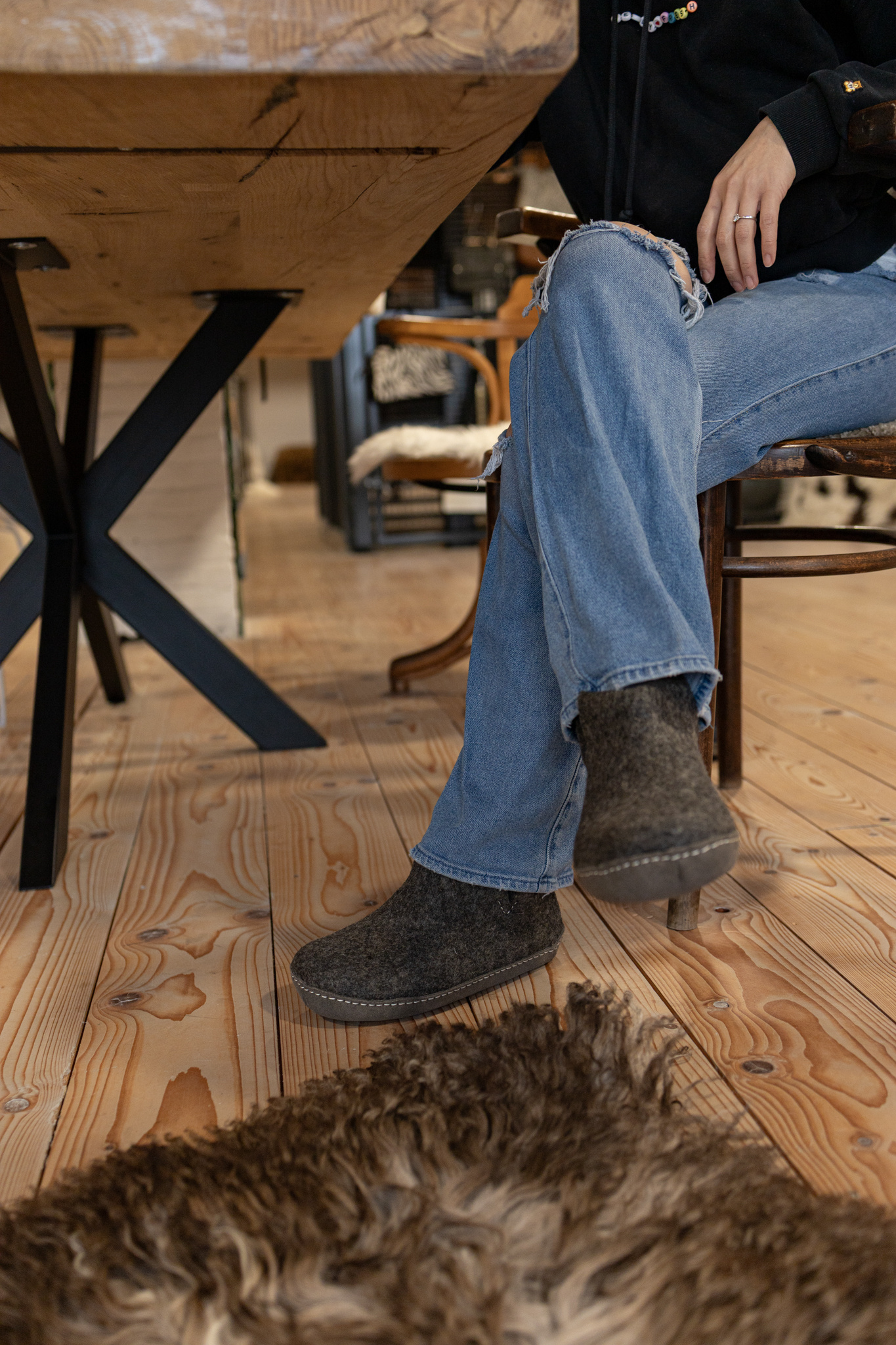 Vilten Hoge Heren Pantoffel Jado - Donkergrijs - Zachte Zool - Maten 42 t/m 46. Comfortabele hoge herenslippers van wolvilt met zachte zool, perfect voor warme en goed ondersteunde voeten binnenshuis. Biedt extra demping en stabiliteit voor dagelijks gebruik.