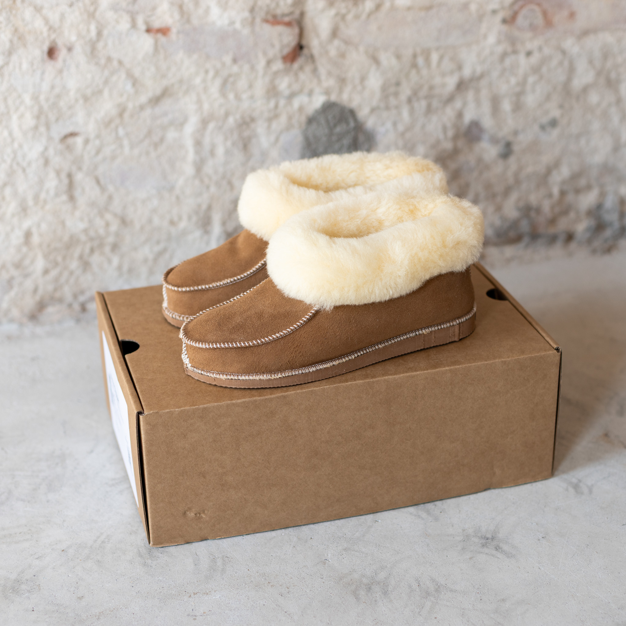 Van het kleuren van de vacht tot het laatste stiksel: alles gebeurt in eigen atelier. Dankzij de stevige rubberen zool zijn ze perfect voor dagelijks gebruik, zowel binnen als even buiten. De vacht is warm in de winter, verkoelend in de zomer en vormt zich naar je voeten voor ultiem comfort.