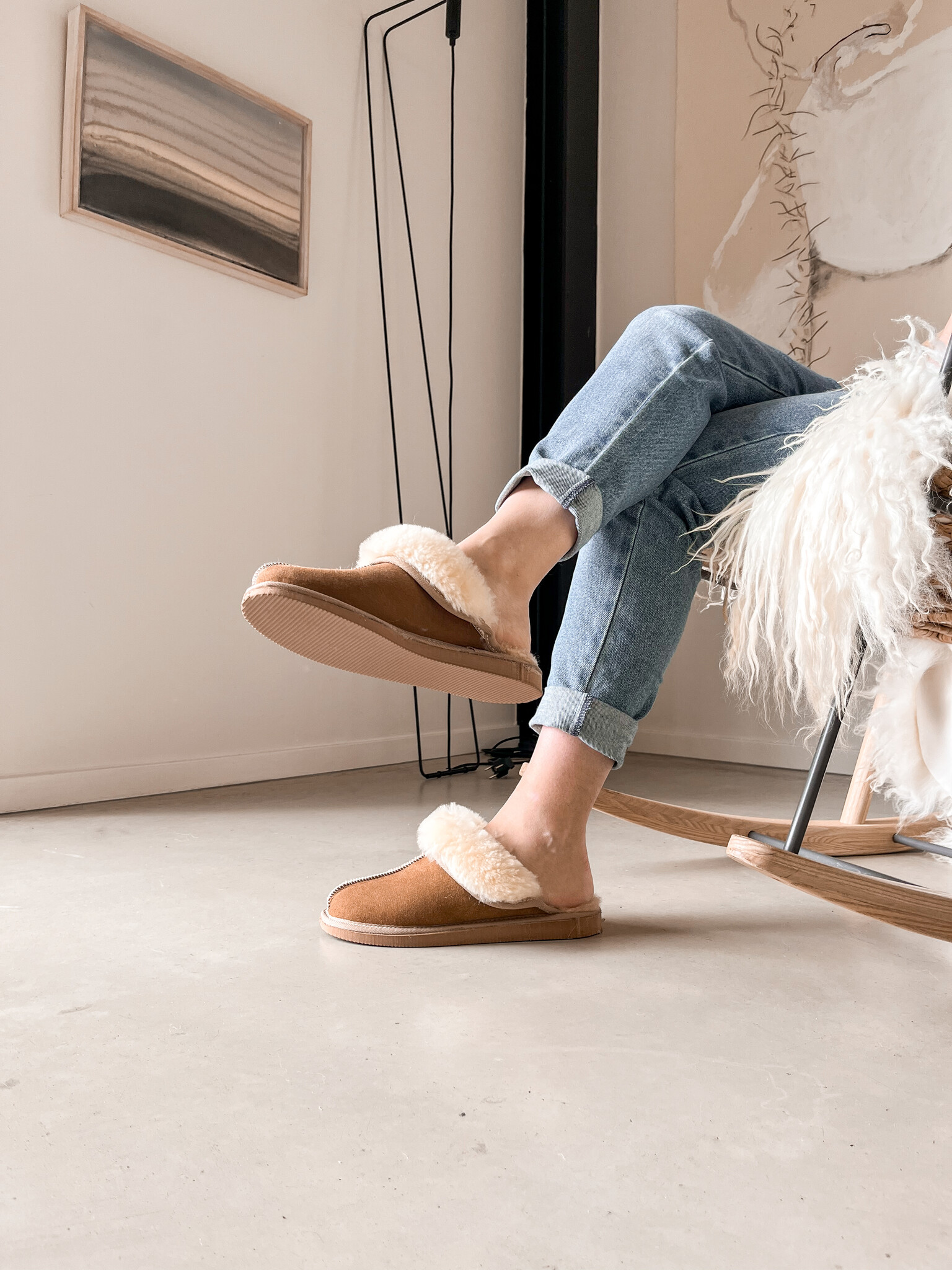 Van het kleuren van de vacht tot het laatste stiksel: alles gebeurt in eigen atelier. Dankzij de stevige rubberen zool zijn ze perfect voor dagelijks gebruik, zowel binnen als even buiten. De vacht is warm in de winter, verkoelend in de zomer en vormt zich naar je voeten voor ultiem comfort.