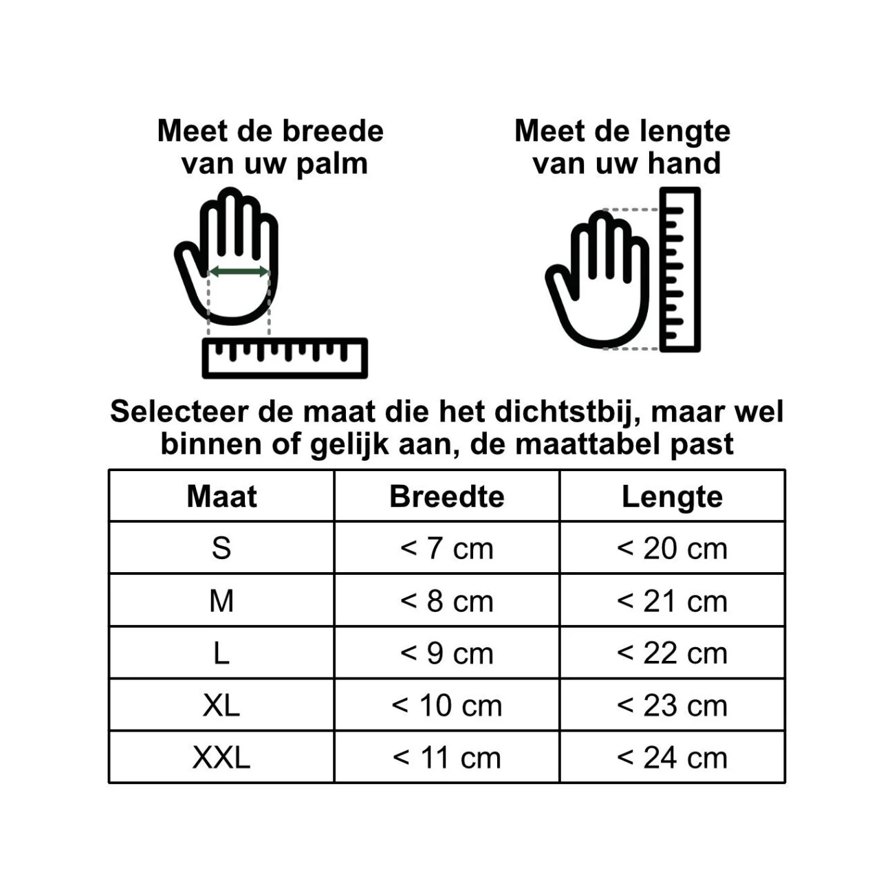 Welke maat kun je dan het beste selecteren? Meet de breedte van je handpalm en selecteer de maat uit onderstaande tabel die het dichts boven de gemeten breedte zit.