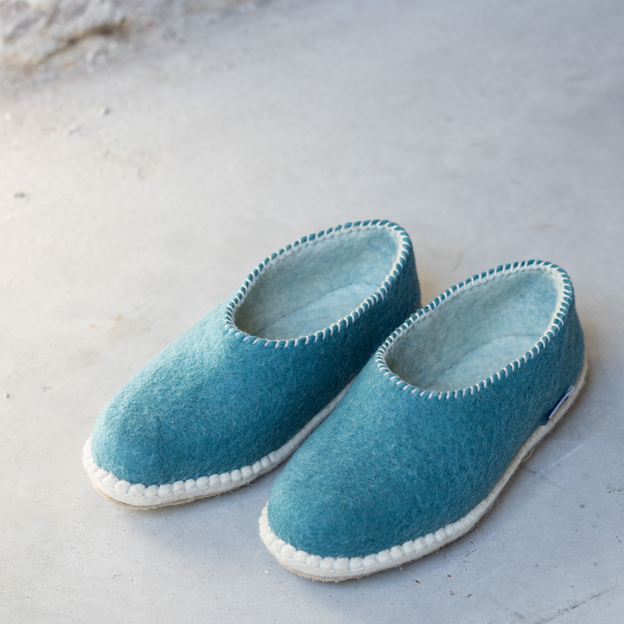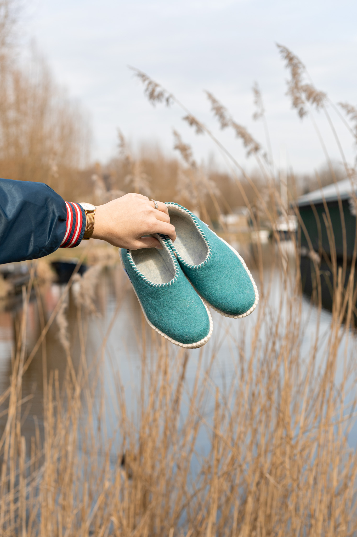 De schapenwollen pantoffels bestaan uit een vilten buiten en binnenlaag. De buiten laag is zeegroene schapenwol. De wol aan de binnenkant heeft de natuurlijke kleur waardoor er nog Lanoline in het gevilte wol zit. Deze wol wordt gemengd waardoor de binnenkant een ecru kleur heeft. De lanoline (dierenwas) die zich in de wol bevindt, wordt gebruikt in de medische wetenschap. Het verzacht de voeten met reumatische, gewrichts- en spierpijn.
