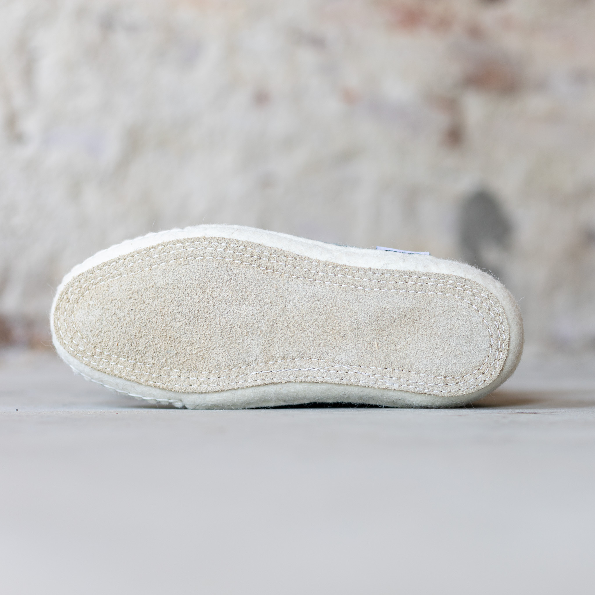 Zool: De pantoffels hebben een extra ecru kleurige laag vilt als zool met daarop een lerenzool. Deze lerenzool heeft een lichte kleur. Sommige maten hebben tijdelijk een beige kleur leren zool. De sloffen hebben een dikkere zool door de extra laag vilt.