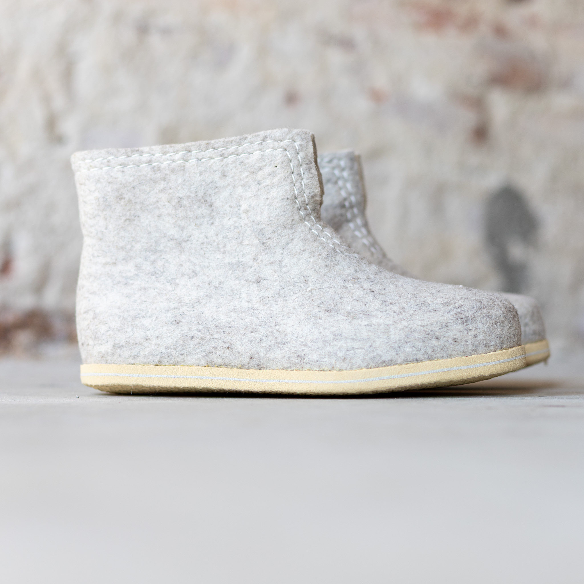 De hoge pantoffels bestaat uit een buiten en binnenlaag. De buiten laag is licht grijze wol. De wol aan de binnenkant heeft de natuurlijke kleur waardoor er nog Lanoline in het gevilte wol zit. De lanoline (dierenwas) die zich in de wol bevindt, wordt gebruikt in de medische wetenschap. Het verzacht de voeten met reumatische, gewrichts- en spierpijn.