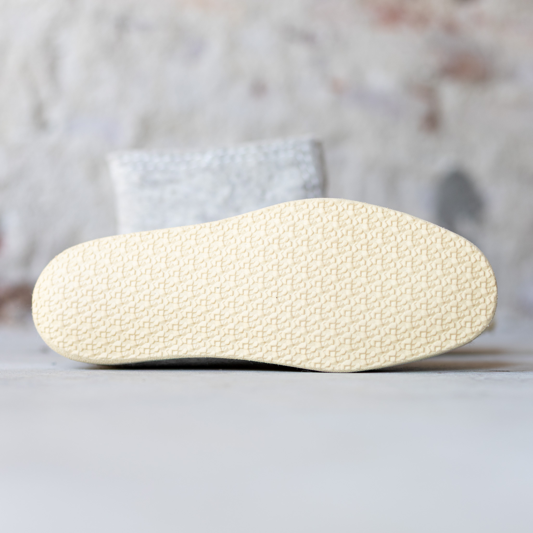 Zool: De sloffen hebben een rubberen zool. Dit zit aan de viltenslof gestikt en gelijmd.