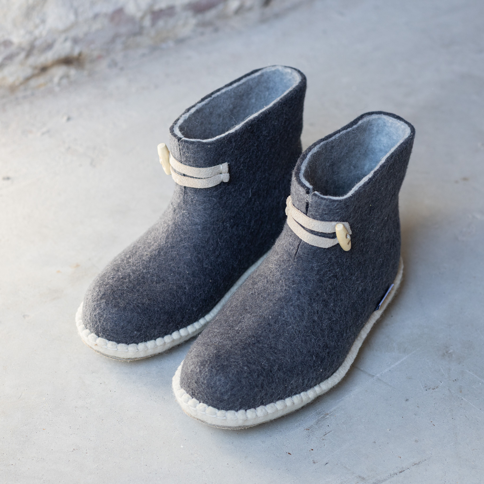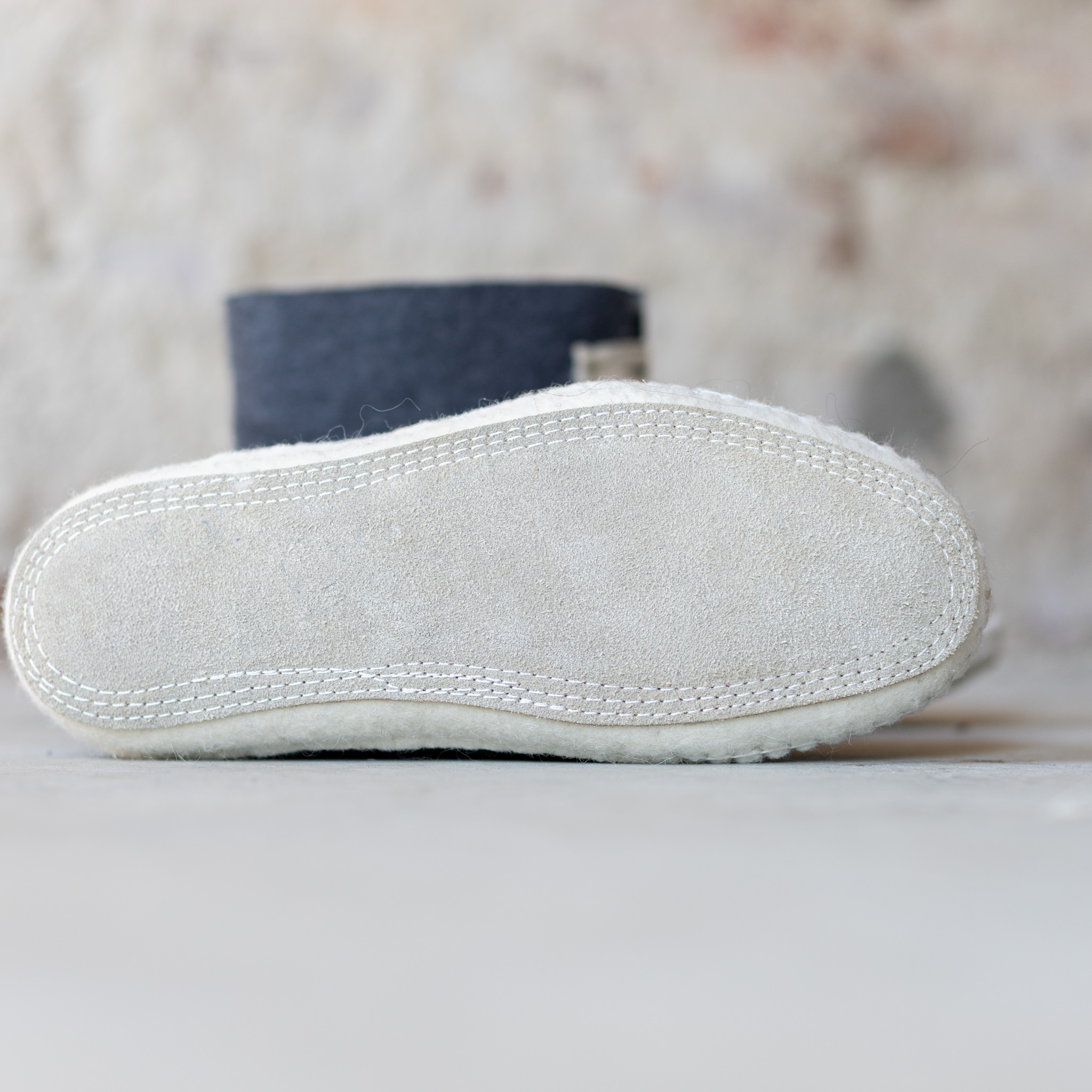 De hoge pantoffels bestaat uit een buiten en binnenlaag. De buiten laag is grijze wol. De wol aan de binnenkant heeft de natuurlijke kleur waardoor er nog Lanoline in het gevilte wol zit. De lanoline (dierenwas) die zich in de wol bevindt, wordt gebruikt in de medische wetenschap. Het verzacht de voeten met reumatische, gewrichts- en spierpijn. En koude voeten zijn verleden tijd met deze wollen sloffen!