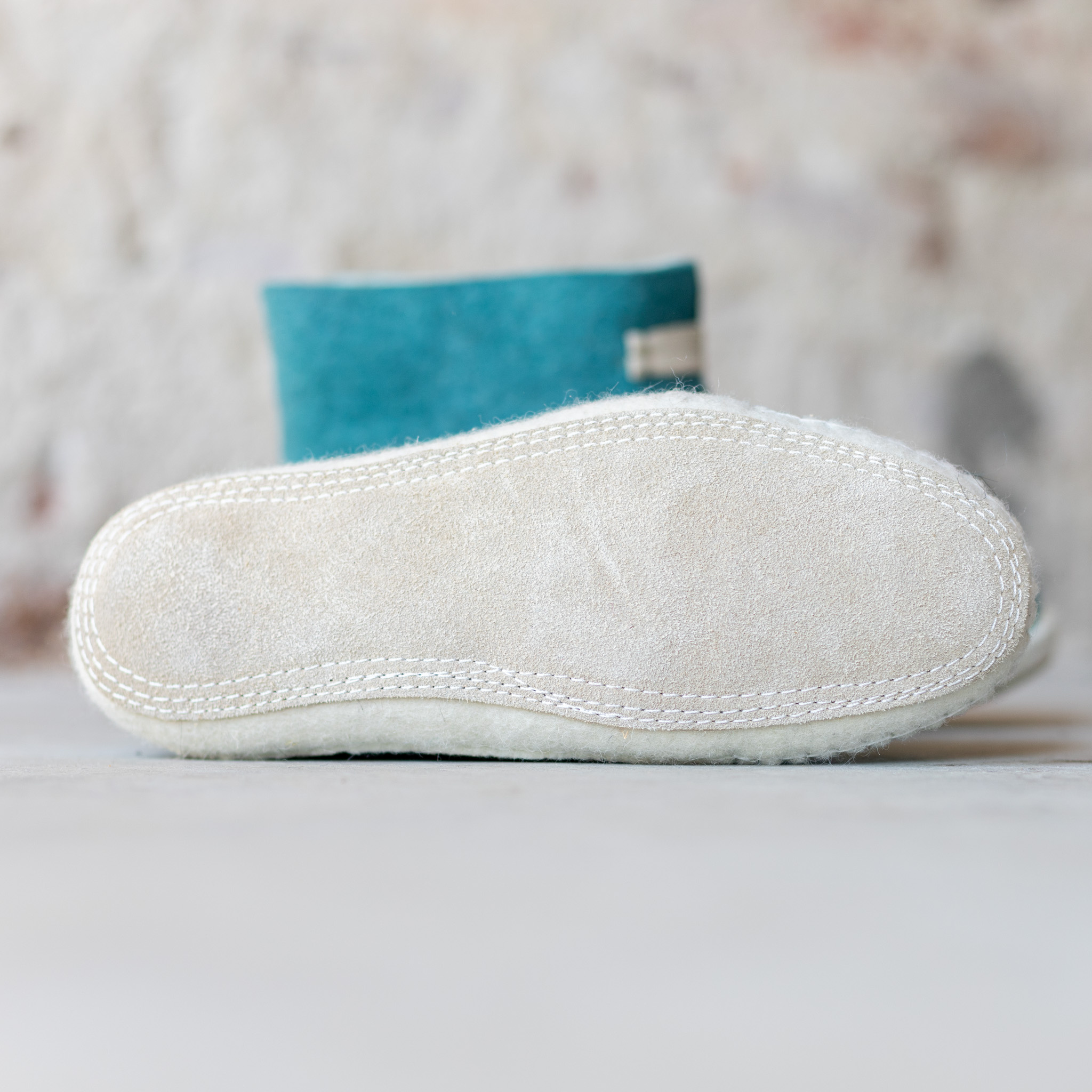 Details: De neus van de vilten sloffen is met de hand gestikt omdat de machine niet bij de punt van de sloffen kan komen.