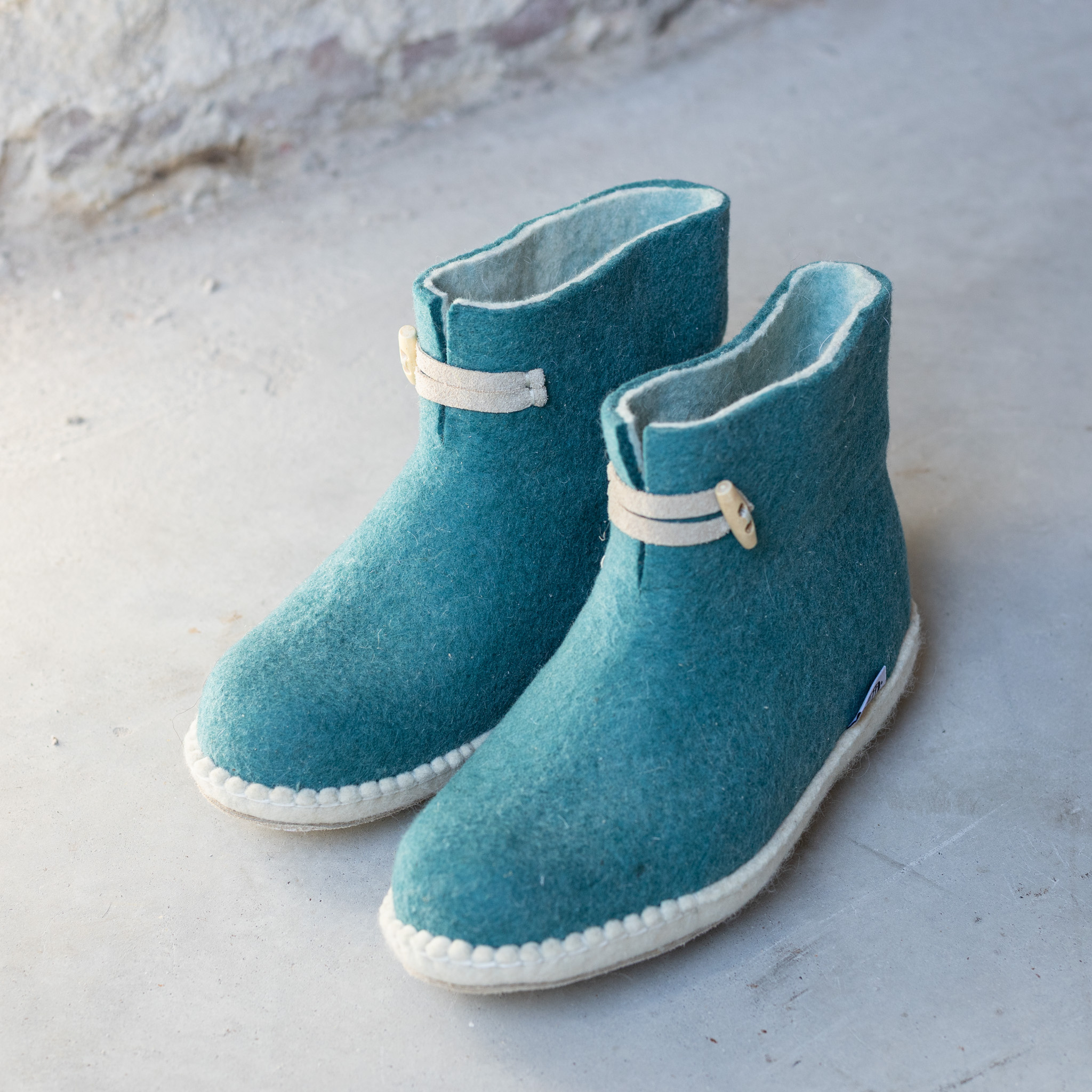 De hoge pantoffels bestaat uit een buiten en binnenlaag. De buiten laag is zeegroene wol. De wol aan de binnenkant heeft de natuurlijke kleur waardoor er nog Lanoline in het gevilte wol zit. De lanoline (dierenwas) die zich in de wol bevindt, wordt gebruikt in de medische wetenschap. Het verzacht de voeten met reumatische, gewrichts- en spierpijn. En koude voeten zijn verleden tijd met deze wollen sloffen!