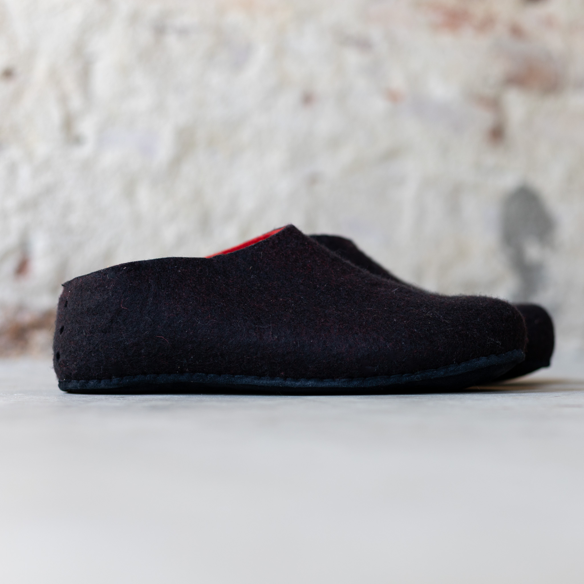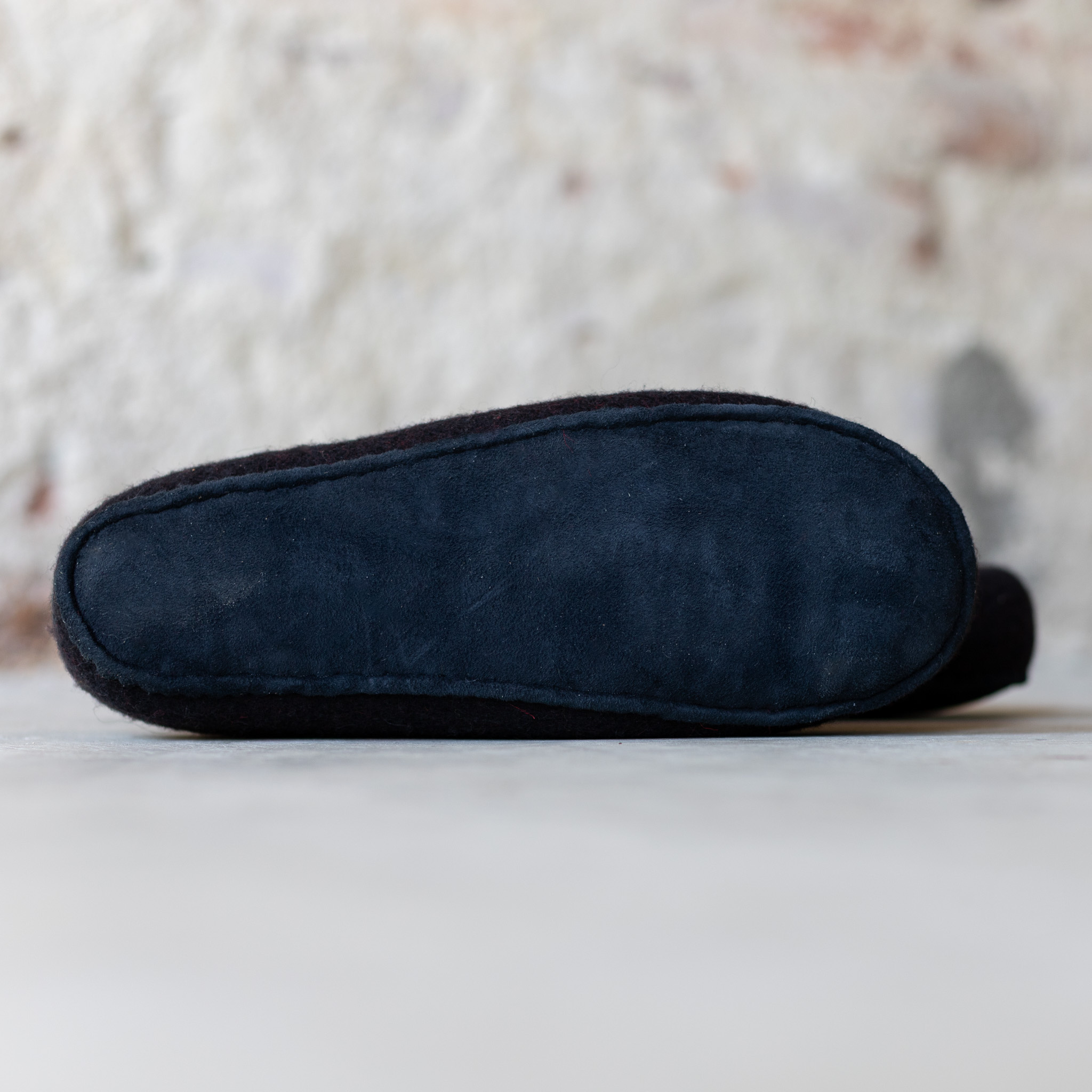De wollen pantoffels bestaan uit een vilten buiten en binnenlaag. De buiten laag is zwarte wol. De schapenwol aan de binnenkant is blauw.