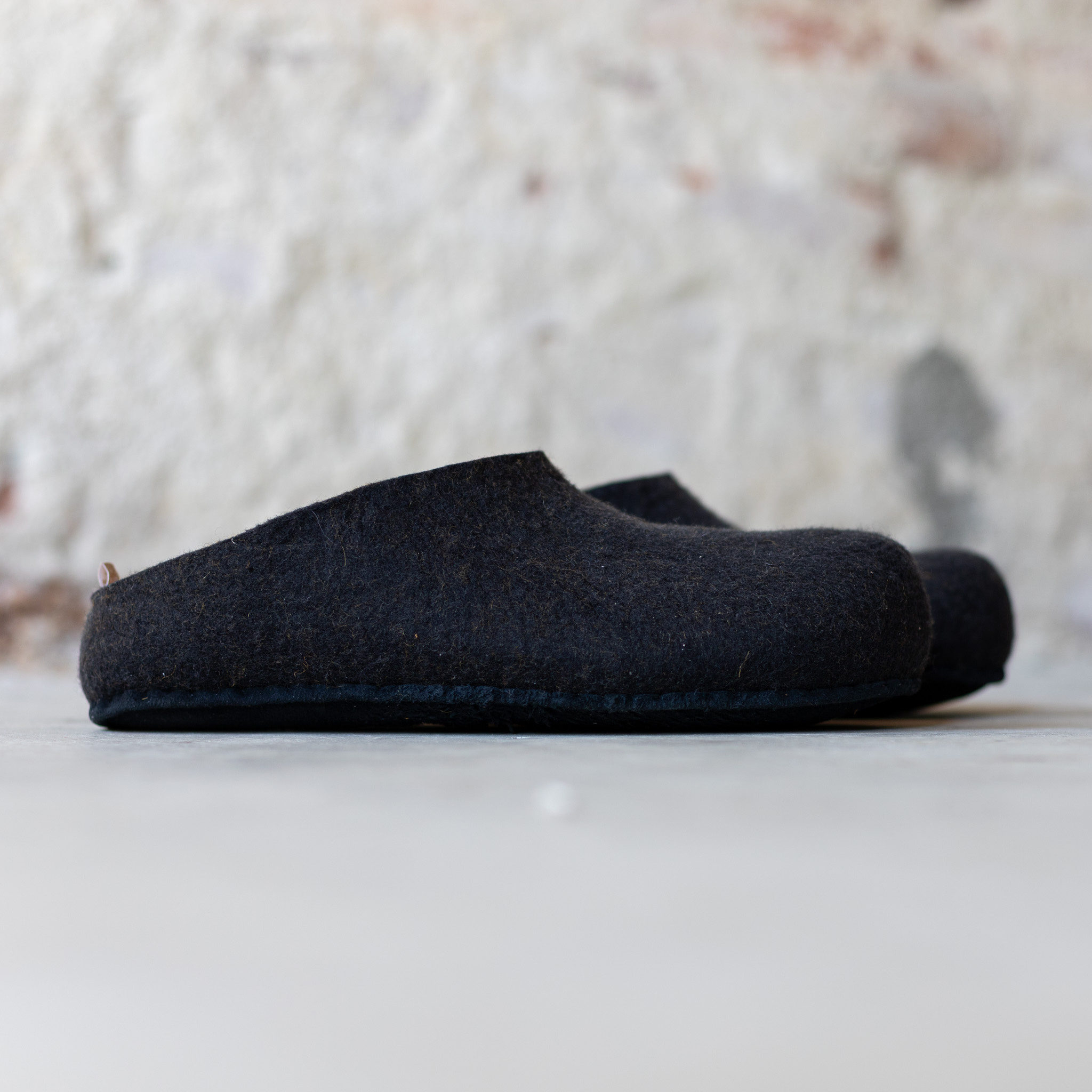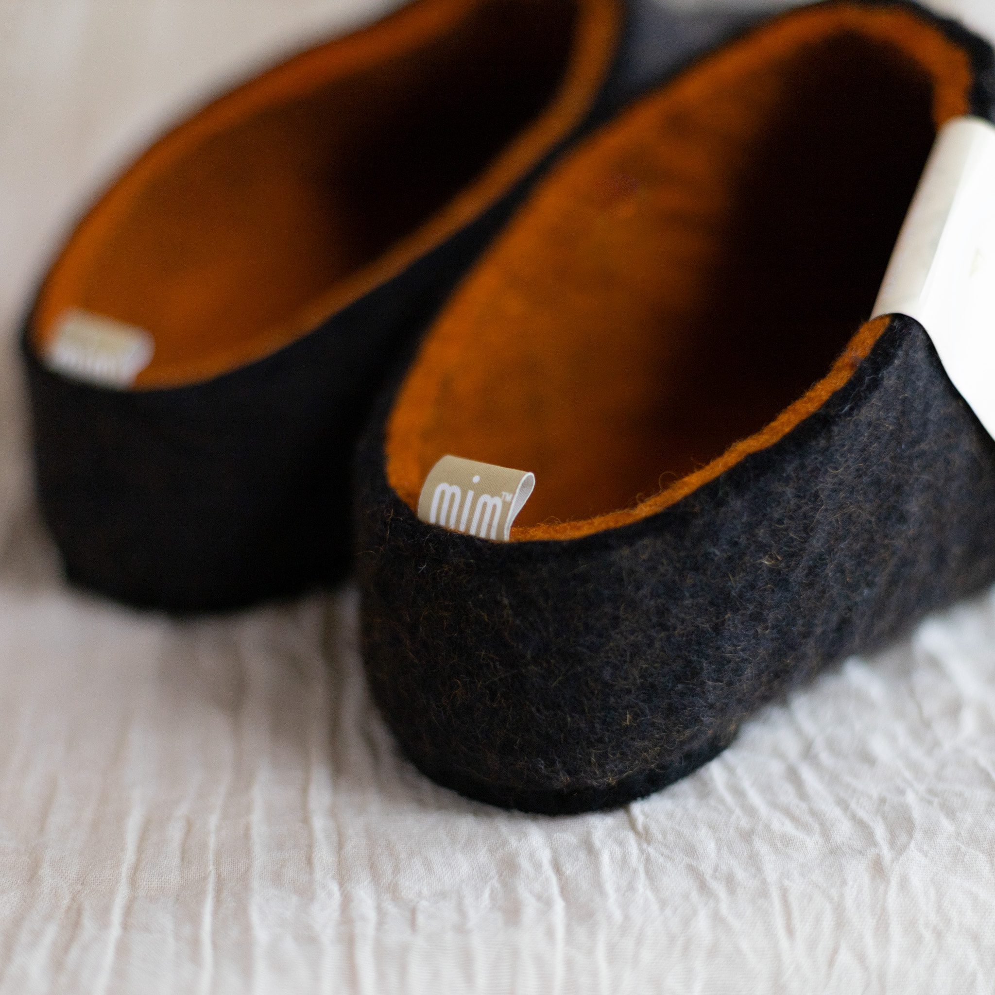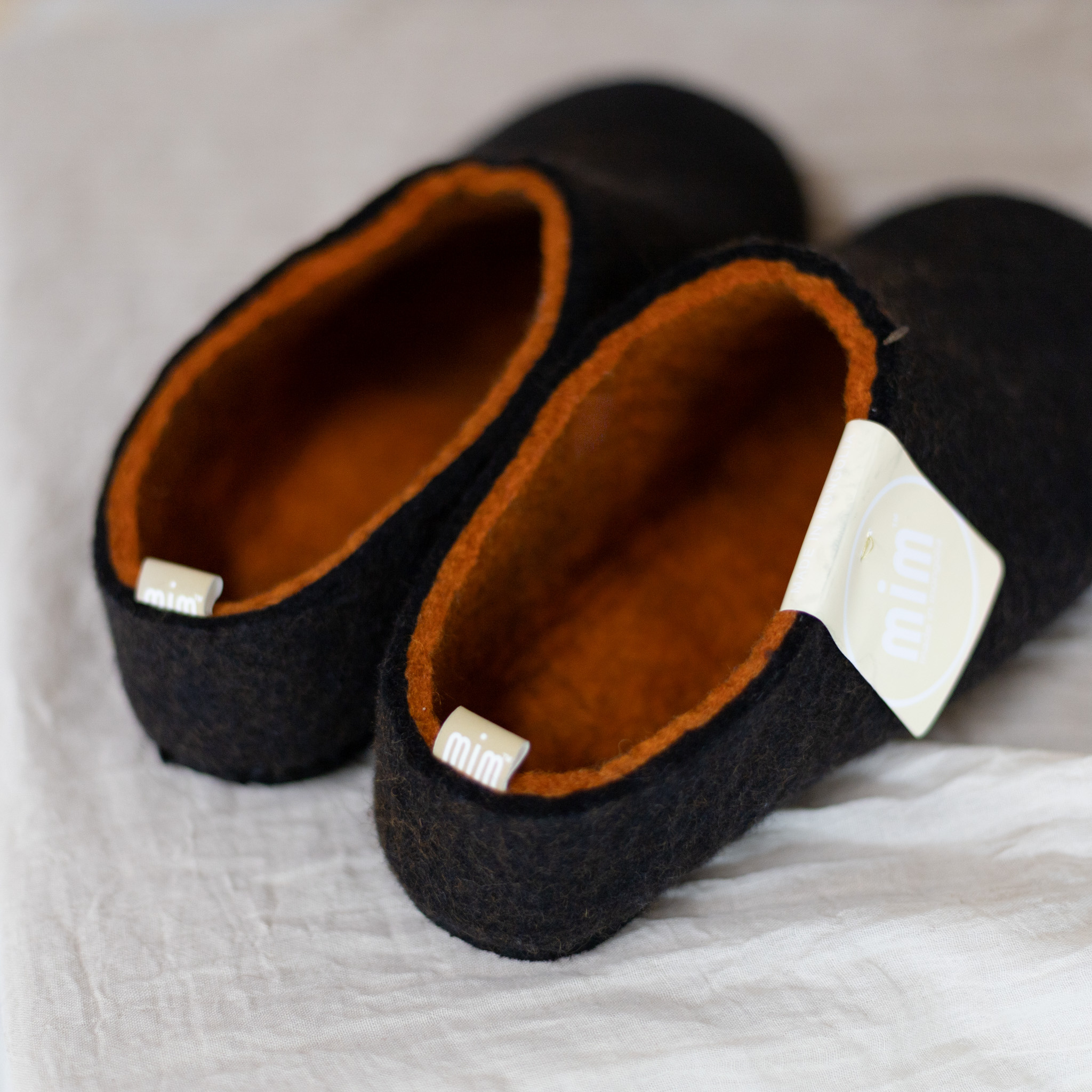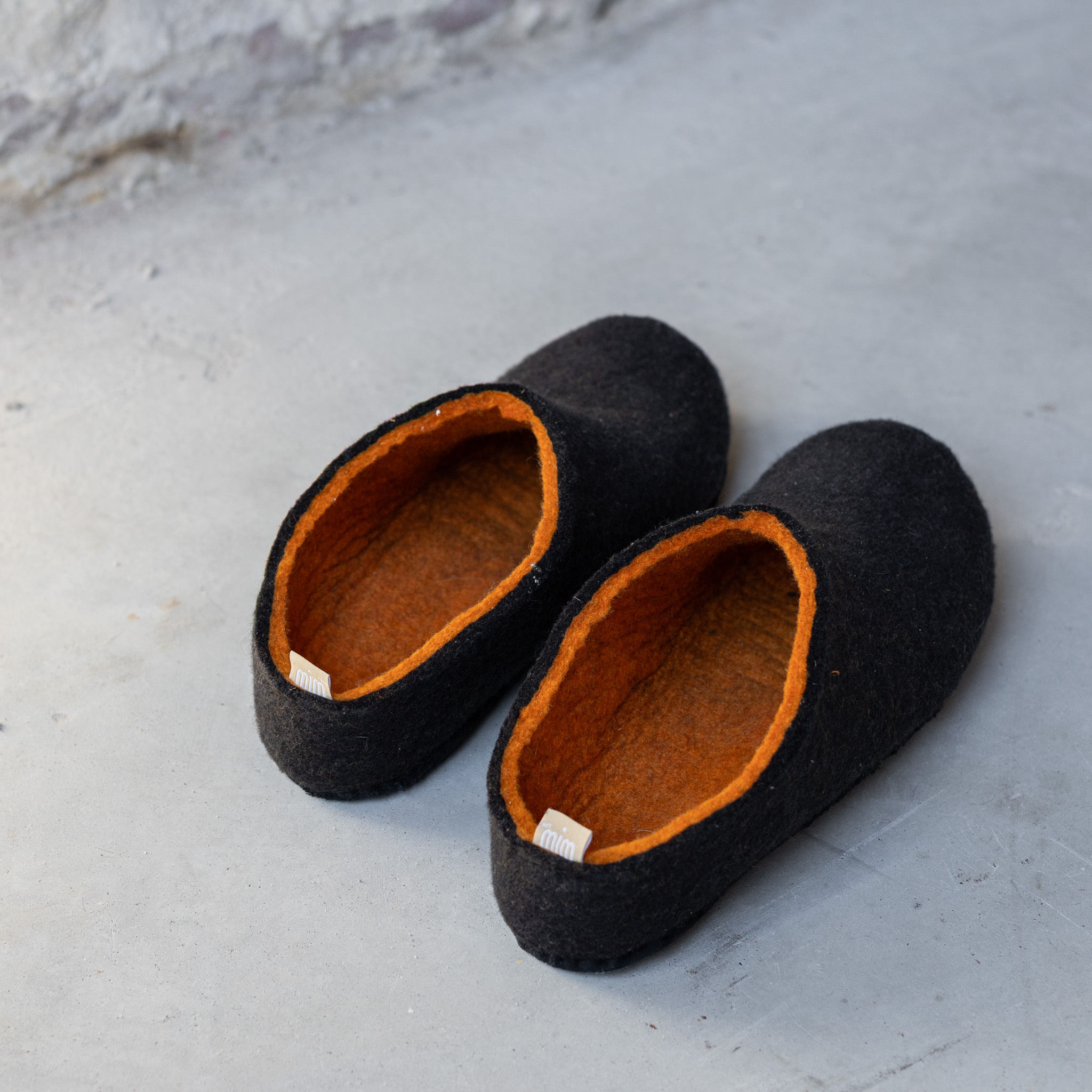 De wollen pantoffels bestaan uit een vilten buiten en binnenlaag. De buiten laag is zwarte wol. De schapenwol aan de binnenkant is oranje.