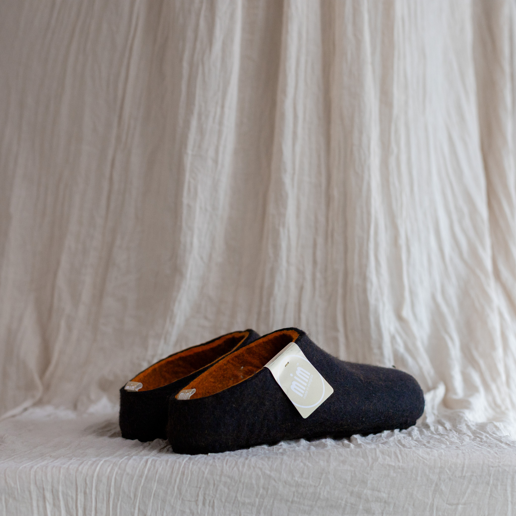 Deze sloffen van vilt zijn gemaakt door vrouwen van MIM. in de Gobi-regio in Mongolië. Zij maken ongeveer 2 paar sloffen per dag. MIM wil vrouwen in staat stellen hun eigen levensomstandigheden en die van hun gemeenschap te verbeteren. Dat gebeurt door ze te leren hoe ze de natuurlijke producten kunnen maken en verwerken, en ze vervolgens een goede eerlijke prijs te geven voor de spullen die ze maken.